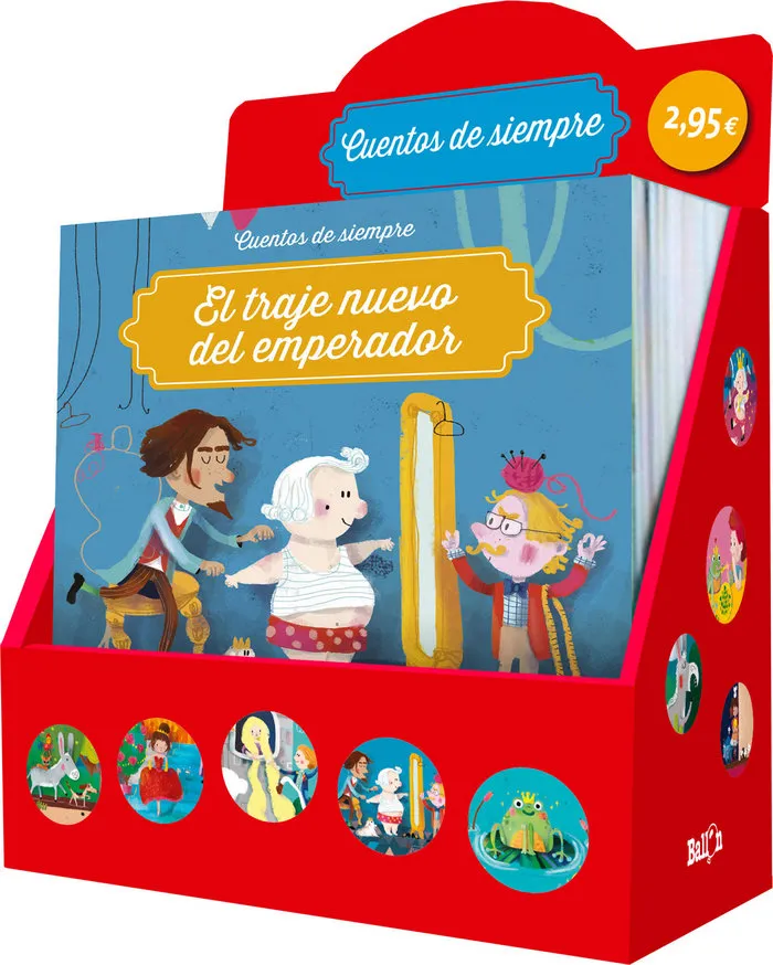 Expositor con 28 ejemplares surtidos. Con unas ilustraciones muy frescas, esta colección de los cuentos infantiles más populares, hará las delicias de los niños a partir de 3 años. Un formato muy agradable y un papel grueso y resistente por un precio muy asequible.
